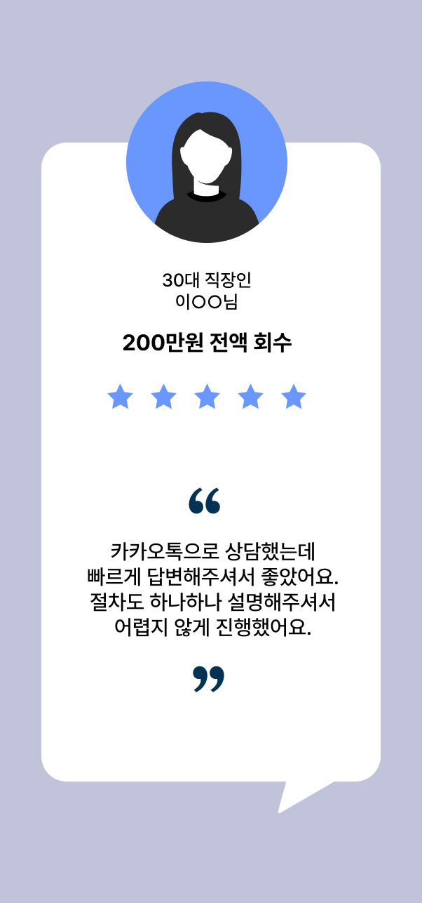 ✓ 차용증 없어도 진행 가능 (계좌이체 내역 OK) ✓ 카카오톡 한 번으로 무료 상담 시작 ✓ 지급명령 → 확정 → 회수까지 단계별 안내