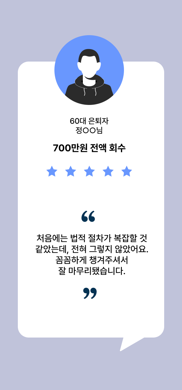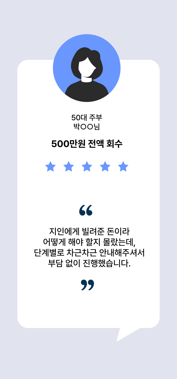 개인 간 금전 문제, 혼자 해결하려다 놓치는 경우가 많습니다. 상황에 맞는 절차 안내로 회수 가능성을 높여드립니다.